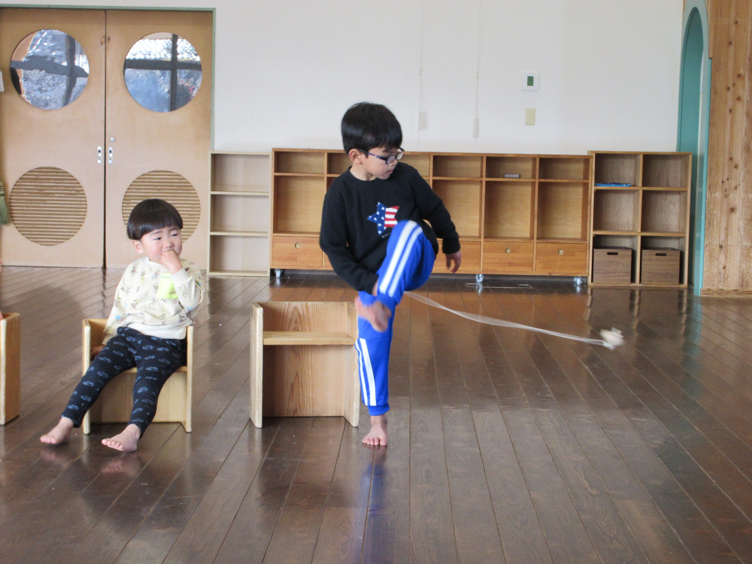 得意なリズムのカメ、トンボ、コマ回しをみんなの前で披露してくれました。
